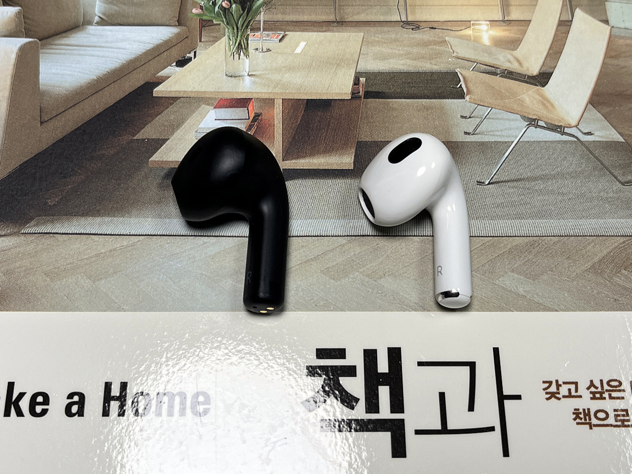 에어팟 3세대와 유닛 비교샷. 정말 비슷하게 생겼습니다만 몰딩까지 훔쳐온 건 아닌지 귀에 끼면 촉감으로 느껴질 정도로 착용감이 다릅니다(제 귀 기준으로 둘 다 불편하지는 않음). 다만 3세대 모양에 가깝기 때문에, 만약 바뀐 AirPods 모양이 불편했다면 이 쪽도 똑같이 불편할 듯 합니다.