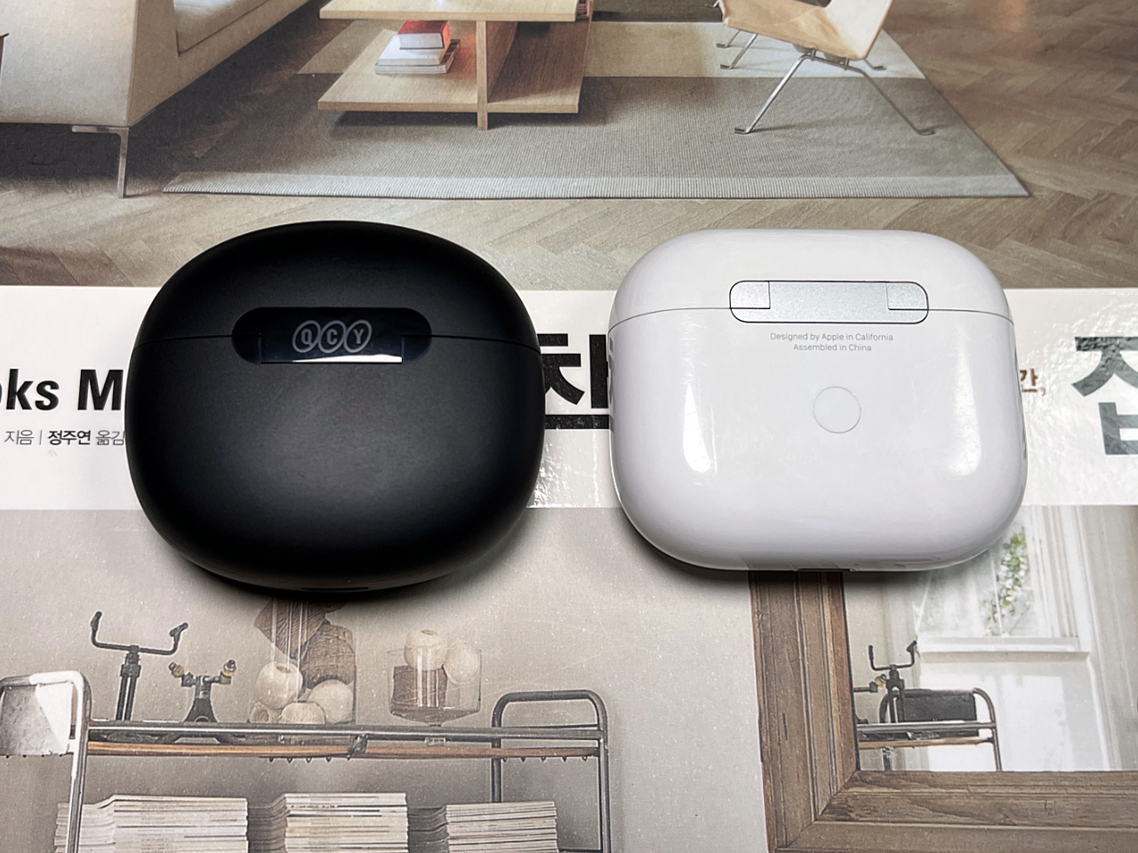 본체의 경우는 QCY 쪽이 좀 더 조약돌 감성. 1세대부터 피젯토이로 완벽했던 AirPods과 달리 QCY 케이스는 뭔가 어설픈데, 뚜껑을 사용자가 끝까지 제껴줘야 한다는 느낌? 내부의 경우 유닛 '막대'를 꽂는 방향이 AirPods은 바깥쪽, QCY는 안쪽이어서 묘하게 헛갈려. '부끄러운' 로고로 로고를 없앤 버전이 더 인기있는 제품이라는 밈이 있을 정도인데, 여기는 본체 뒷면 힌지에 찍혀있어서 걱정없어.