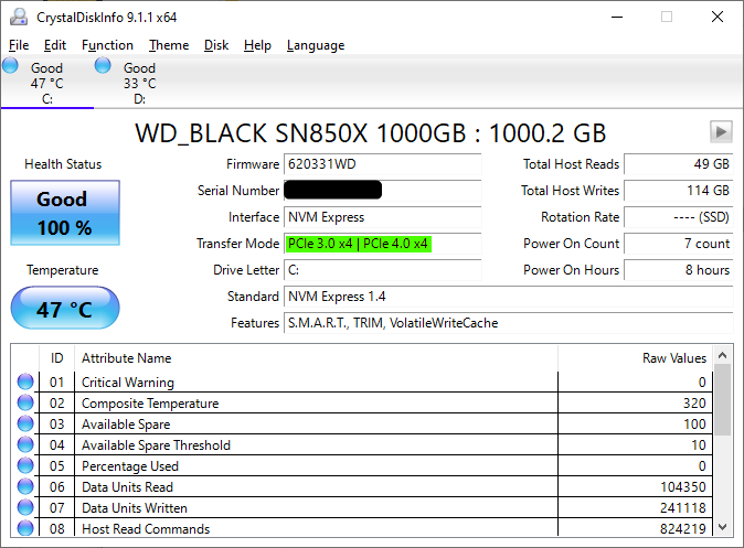 WD BLACK SN850X는 PCIe 4.0 스펙이어서 3.0까지 지원하는 현재 메인보드에는 오버스펙이지만, 스토리지는 가장 쉽게 떼어갈 수 있는 제품이기 때문에 퓨처프루핑을 겸해 구입했습니다. 반쯤 충동적으로 구입후 검색해보니 11번가 아마존 직구로는 1200원대로 원/달러 환율이 좋던 7월 경 7~8만원대까지도 나왔지만 이건 정식 수입제품이니 1대 1로 비교하기는 애매하지만요.