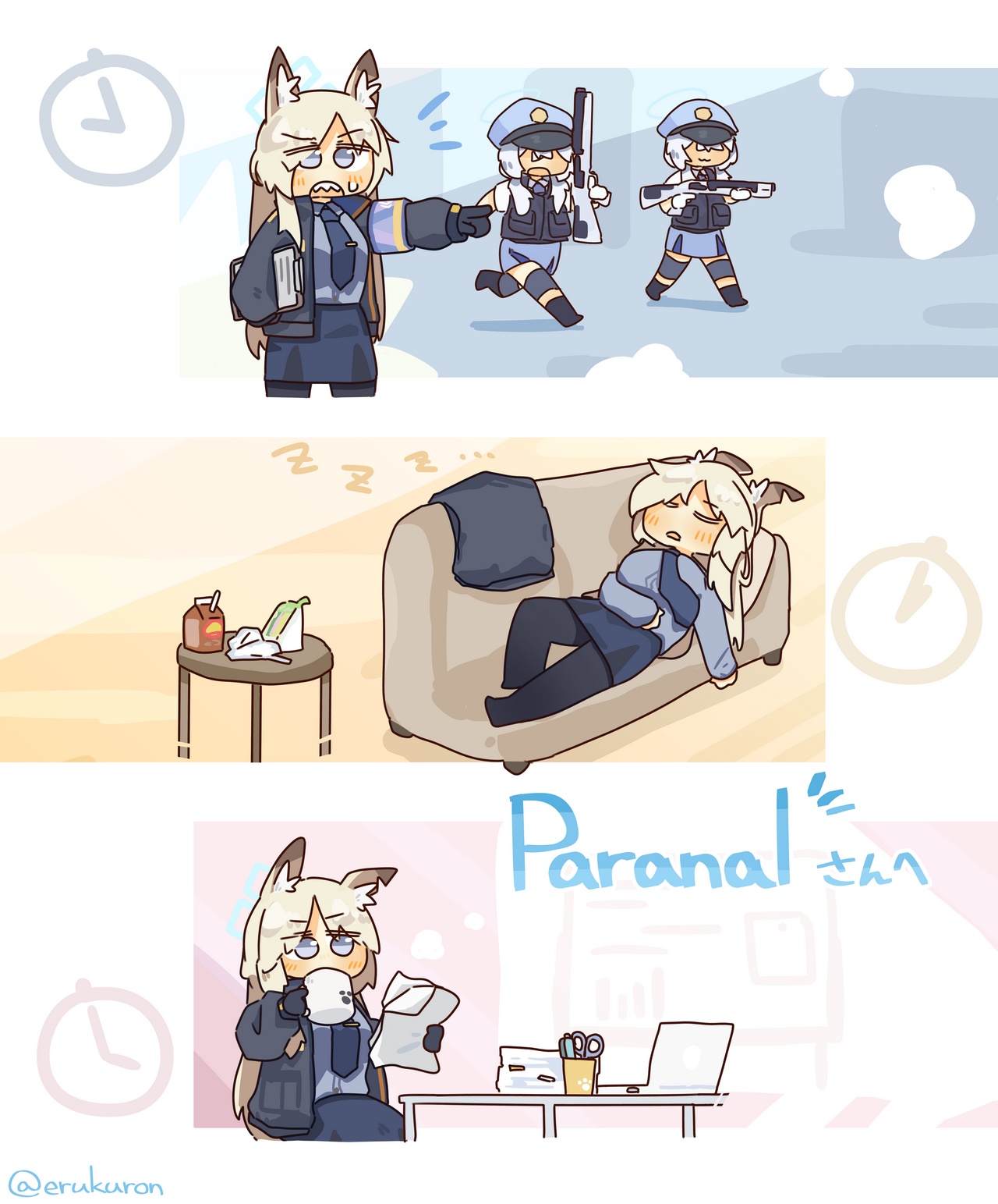 콘셉트는 '칸나의 하루' 로, 윗사람도 아랫사람도 믿을 수 없는 중간직의 고충을 클리셰하게 표현해 보았는데요. 사실 첫 컷에 부하를 넣었으니 균형을 맞추려면 윗사람도 나와야겠지만 '굳이?' 싶어 생략했습니다.