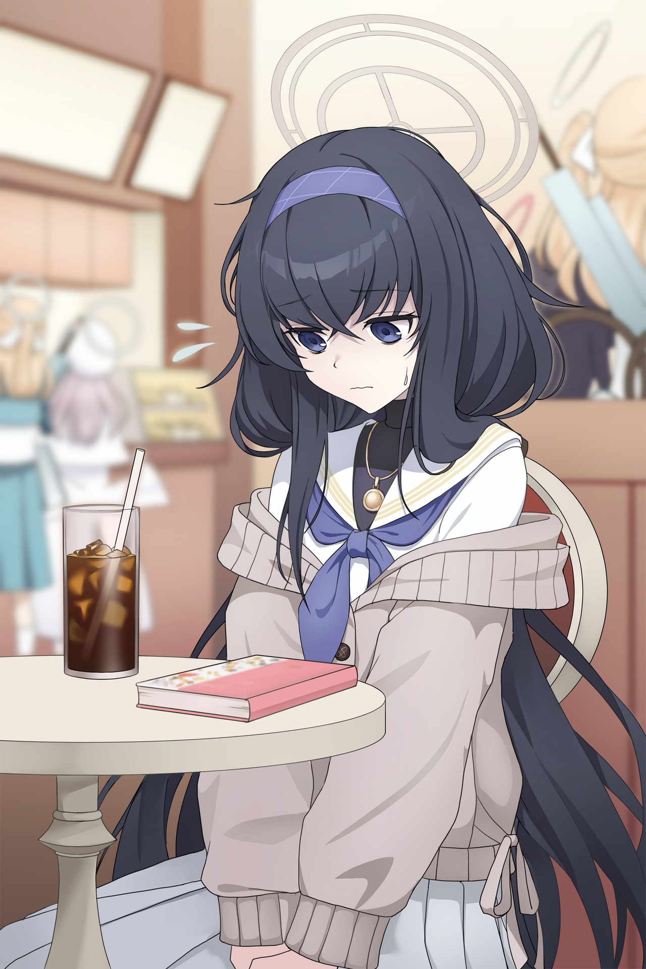 이번 그림도 우이인데, 이전 작품과는 달리 자신감이 없어 보입니다. 역시 외출은 썩 내키지 않지만, 본인이 좋아하는 아이스커피와 '새 아이'(책)을 앞에 둠으로서 그나마 당장 고서관으로 회수당하지 않고 목 좋은 카페에 앉아있을 수 있다는 설정입니다.