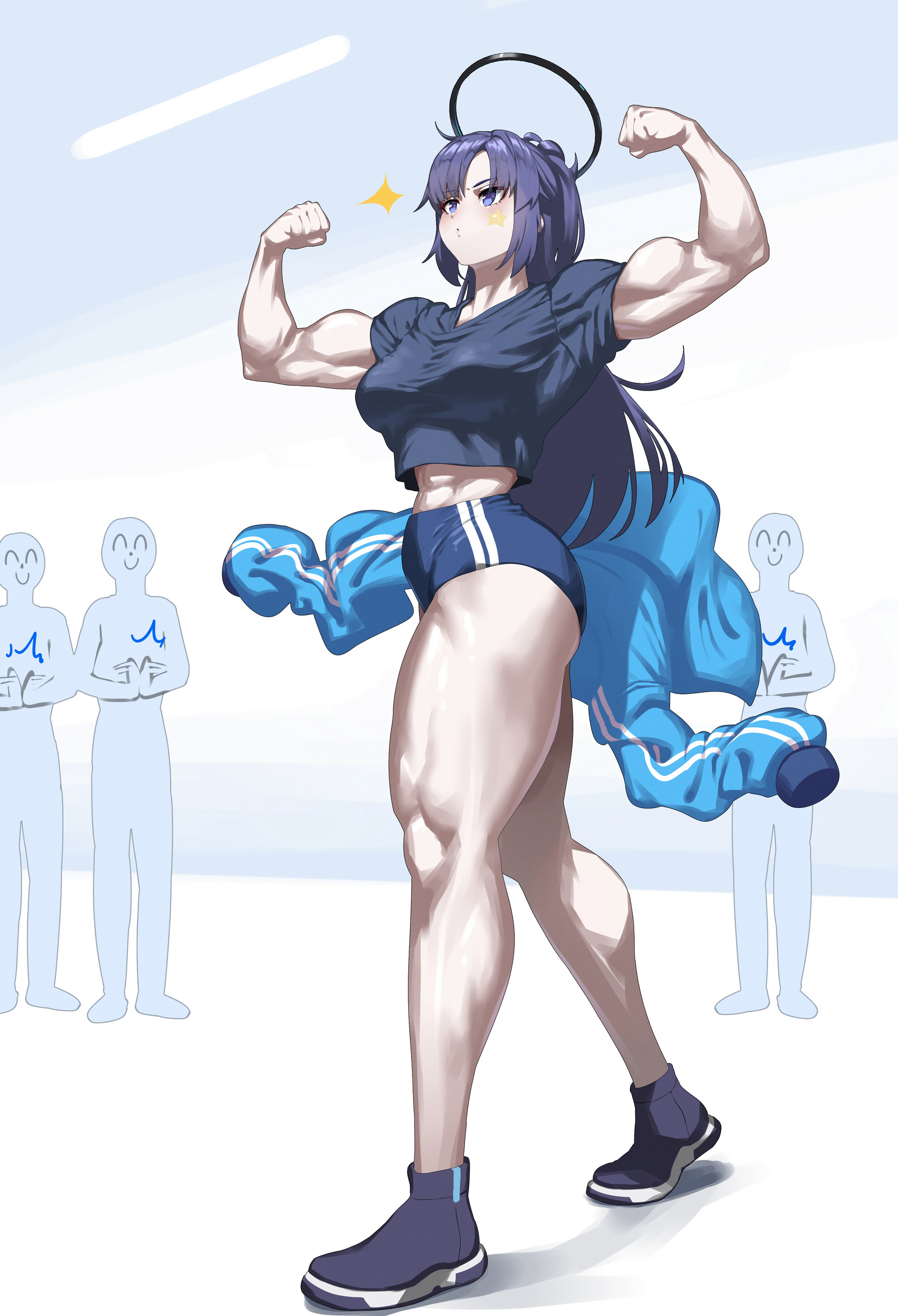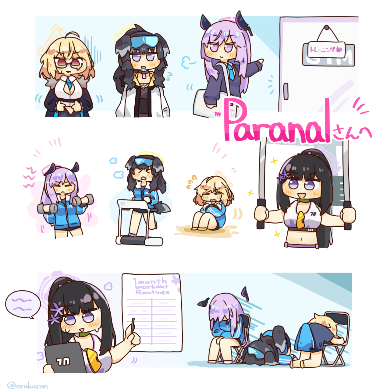 '블루 아카이브'에서 전형적인 '공순이' 캐릭터인 엔지니어부와 스미레가 함께 등장하는 콘셉트인데요. 작중에서도 체력 부족이 여러 번 언급되었을 정도인 엔지니어부가 이를 해결하기 위해 트레이닝부의 스미레를 찾아갔지만, 두 집단의 '가벼운' 운동의 기준이 너무 다르다는 걸 온 몸으로 체험하고 말았다는 느낌입니다.