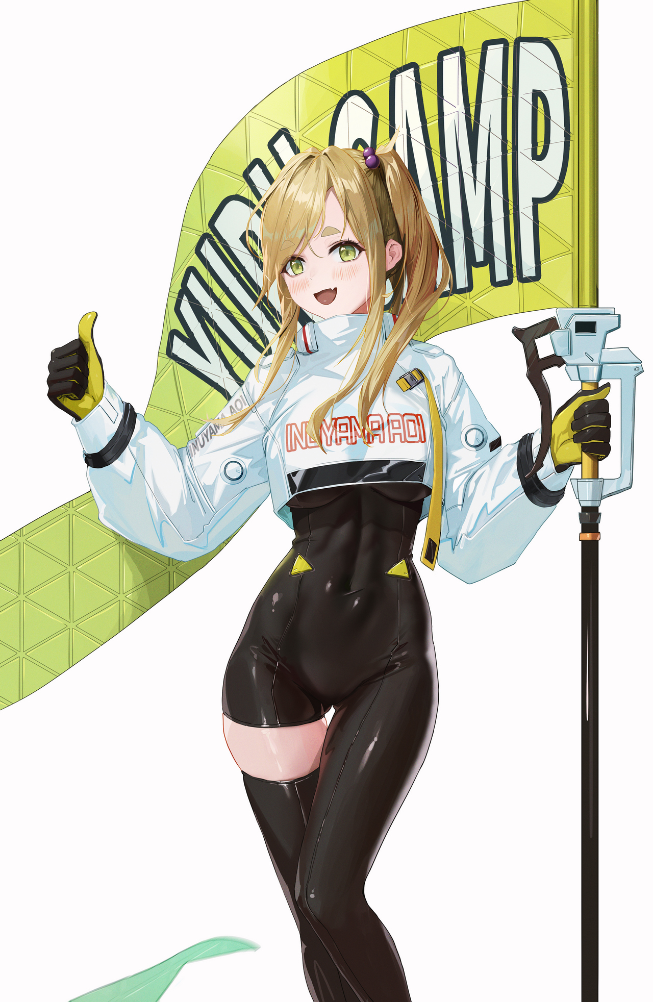 이번 이누야마 아오이도 복장 교환 콘셉트인데, 레이싱 미쿠 2022 의상입니다. 의뢰서에서는 지난번처럼 소품 추가 가격 폭탄을 맞을까 걱정되어 깃발은 빼려고 했는데 감사하게도 추가 비용 없이 그려 주셔서 해당 요소를 살리게 되었습니다. 원본의 스폰서 자리는 비워두기는 어색해 즉흥적으로 캐릭터명과 작품명을 로마자로 적어 달라고 요청드렸는데 이런 변형도 제법 어울리네요.