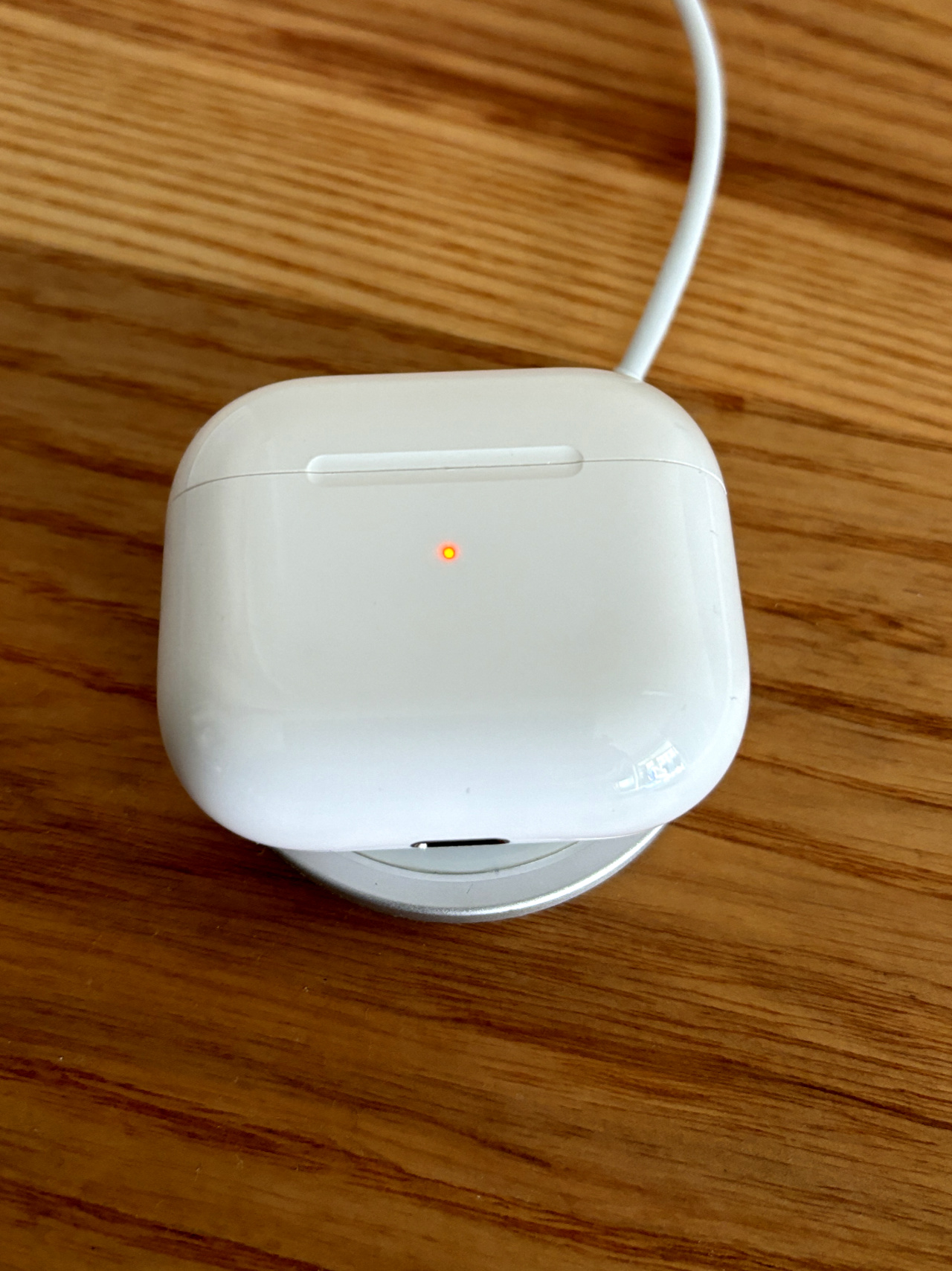 다만 역시 충전 장비를 다이소발로 쓰는 건 왠지 찝찝해서 테스트 용으로 몇 번 써보고는 케이블 파우치에 보관만 해 두고 있었는데, iPhone 15을 구입하고 나서 새 용도를 발견했습니다. 바로 여전히 Lightning을 사용하는 AirPods 충전이어었는데요. 처음에는 15cm USB-A Lightning 케이블을 PC USB 단자에 꽂아 충전했지만 이것도 불편해 고민하다 떠올린 아이디어였는데요. 어차피 저전력으로 충전되고 한두시간 정도 사용하기 때문에 안성맞춤.