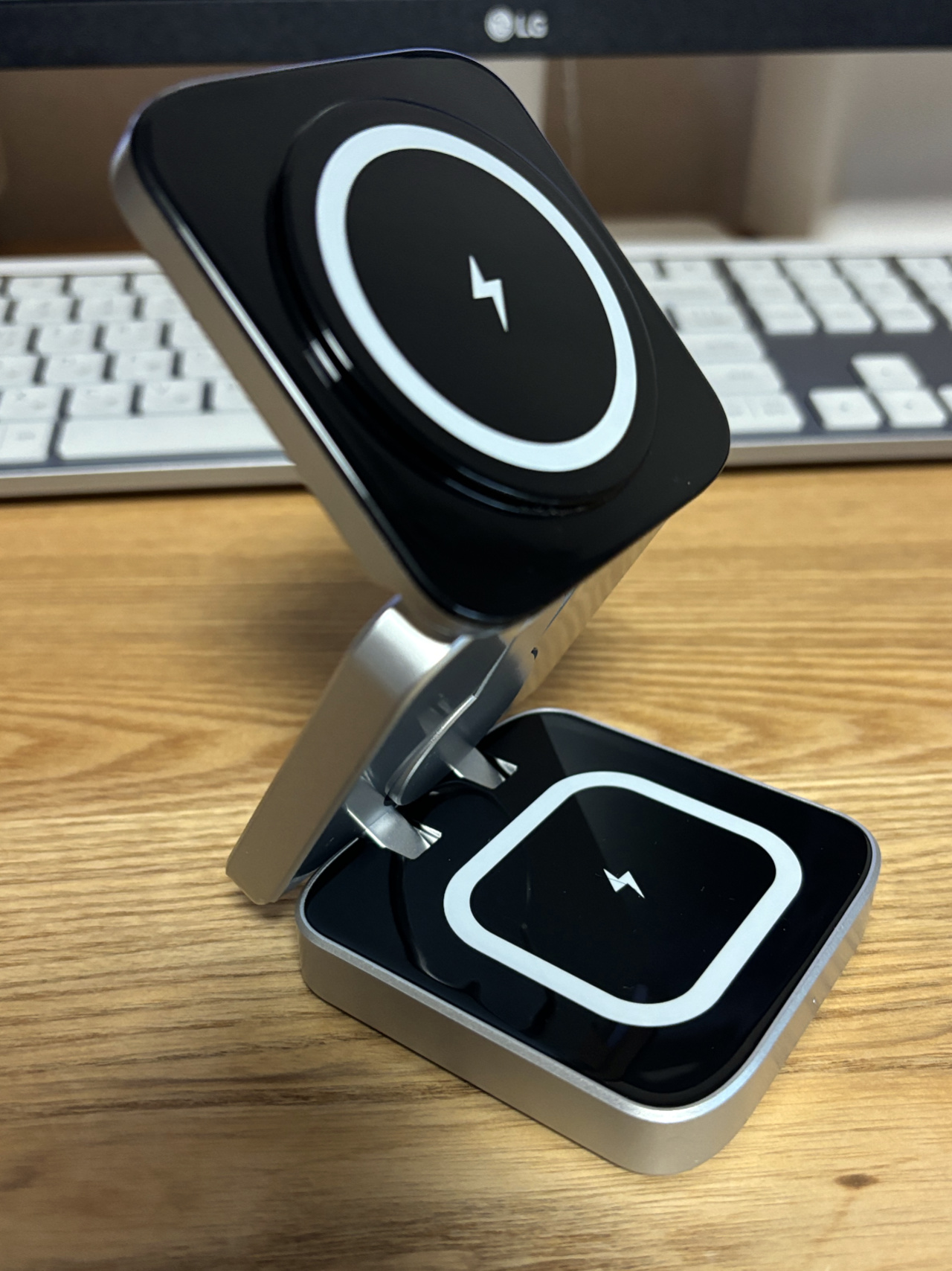 사진으로 보기에는 만원도 비싼 가격 같은 질감이지만 아랫쪽에 무게추가 있어 무게도 어느 정도 있고-실측해보니 약 190g-힌지도 딱 잡아주는 느낌이 있어 생각보다는 괜찮습니다. 물론 Z자 모양으로 펼친 뒤 아이폰을 세로로 붙인 상태에서 터치하면 멀미날 정도로 흔들리지만 자석 있는 부분만 올려 가로 거치하면 제법 단단하게 붙잡아 줄 정도의 자력은 됩니다. 기기 충전 시 발열도 5천원짜리 다이소 퍽형 충전기보다는 잘 관리해주는 느낌이고요.