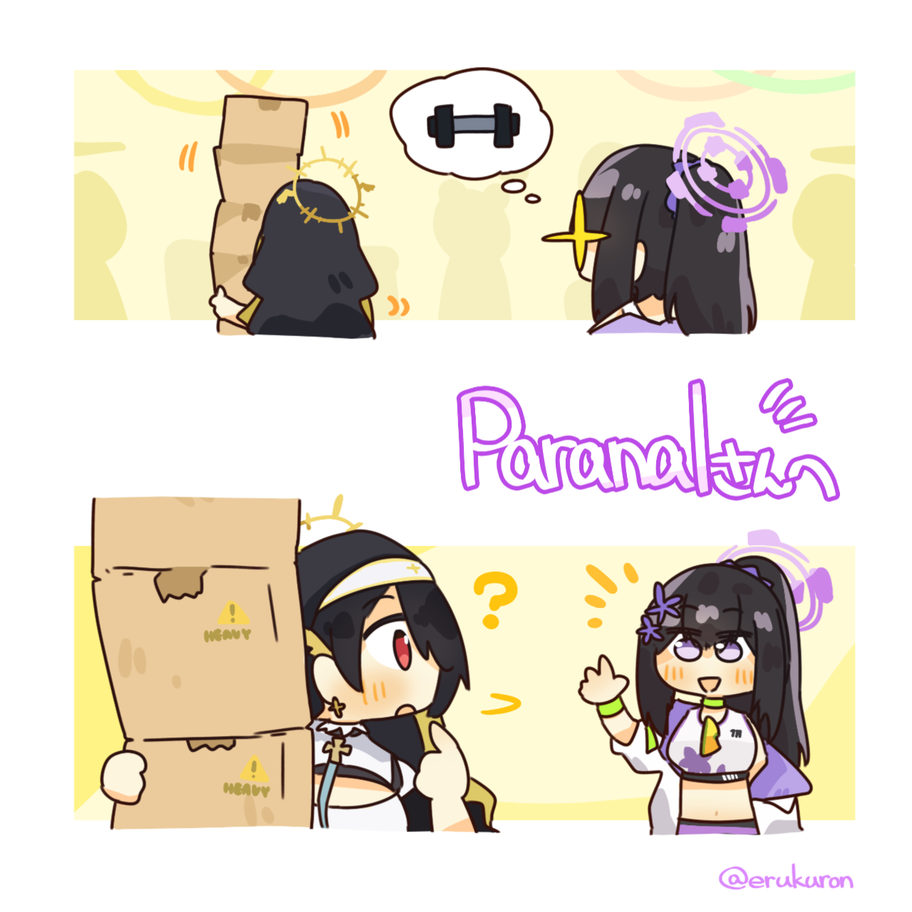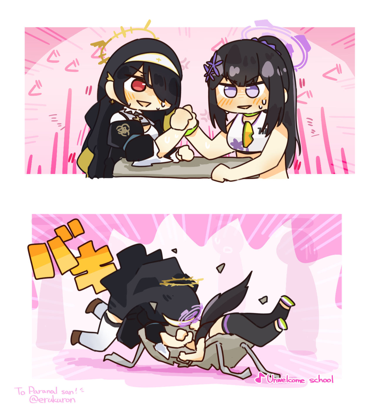엄격하게 말하면 두 장짜리 작품이지만 그대로 이어붙여 네 컷 만화라라고 해되 어색하지 않은 전개로 그려주신 게 흥미로운데요. 이전부터 언급했듯 팔씨름 키워드를 좋아하기 때문에 세 번째 컷은 기회가 되면 다른 작가에게 의뢰해 '리메이크'해보고 싶기도 합니다.
