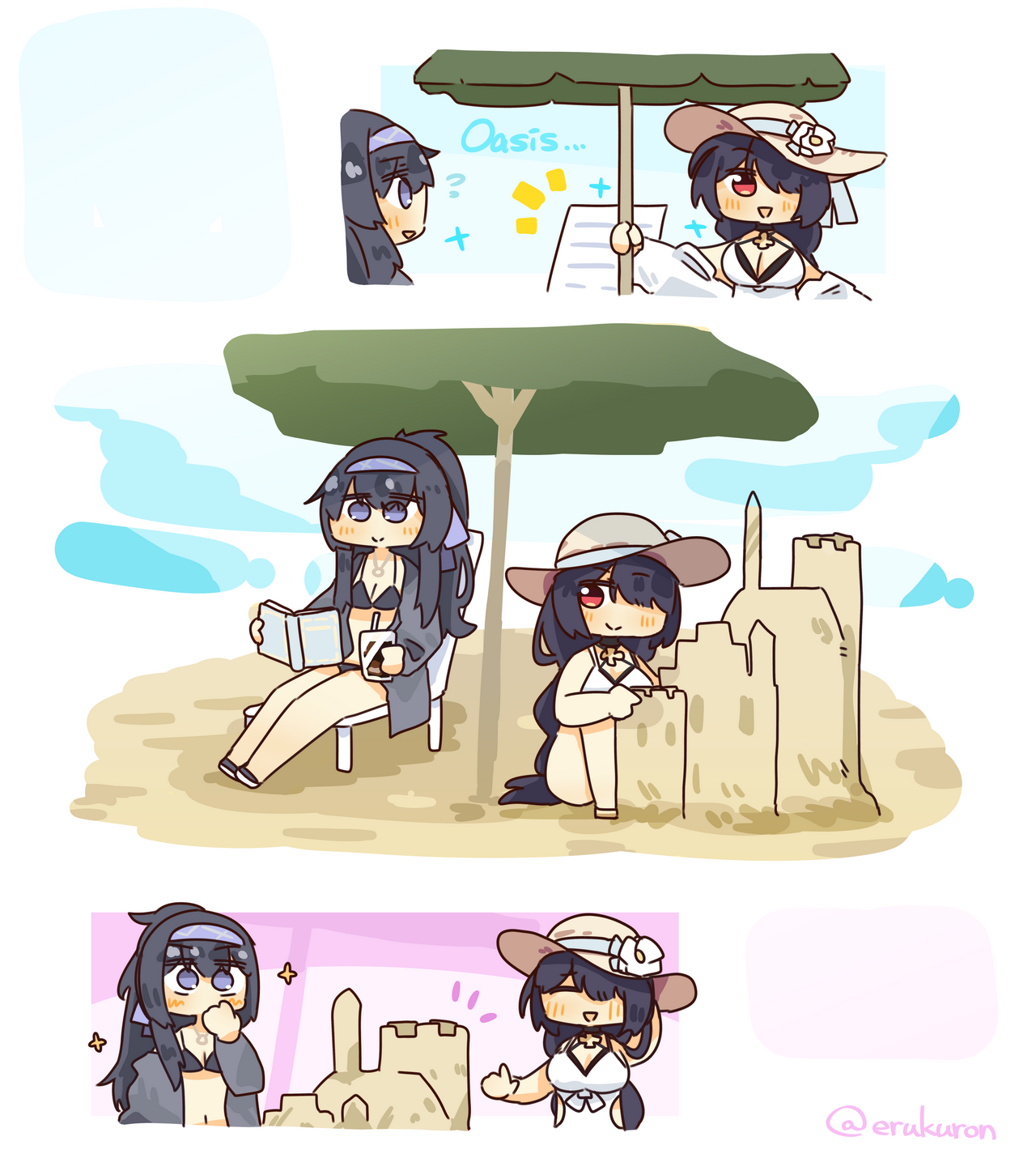 곧 한국/글로벌 서버에 실장될 히나타와 우이 수영복 의상을 기반으로 한 콘셉트인데, 세부 내용은 두어 번 바꾸었지만 최종적으로는 가장 클리셰한 방향으로 진행했습니다. 히나타는 전형적인 픽션형 덜렁이라는 설정이지만, 왠지 손재주는 있을 것 같다는 뇌피셜로 예술작품 수준의 모래성을 만드는 장면을 넣었습니다.