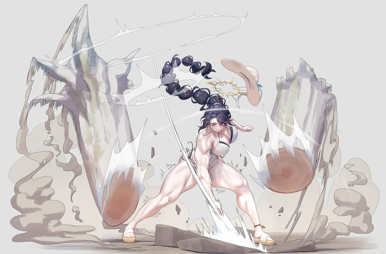 다음 두 장은 '블루 아카이브'의 와카바 히나타(수영복)입니다. 히나타는 원래부터 괴력녀 기믹이 있는데, 수영복 스킨 인연 스토리에서 바위를 자갈처럼, 고목을 나뭇가지처럼 치우는 에피소드를 보고 이건 '각'이 나온다고 그 자리에서 생각해 버렸습니다.