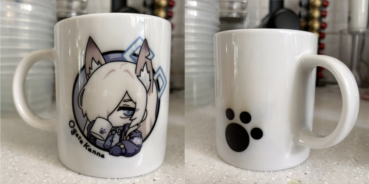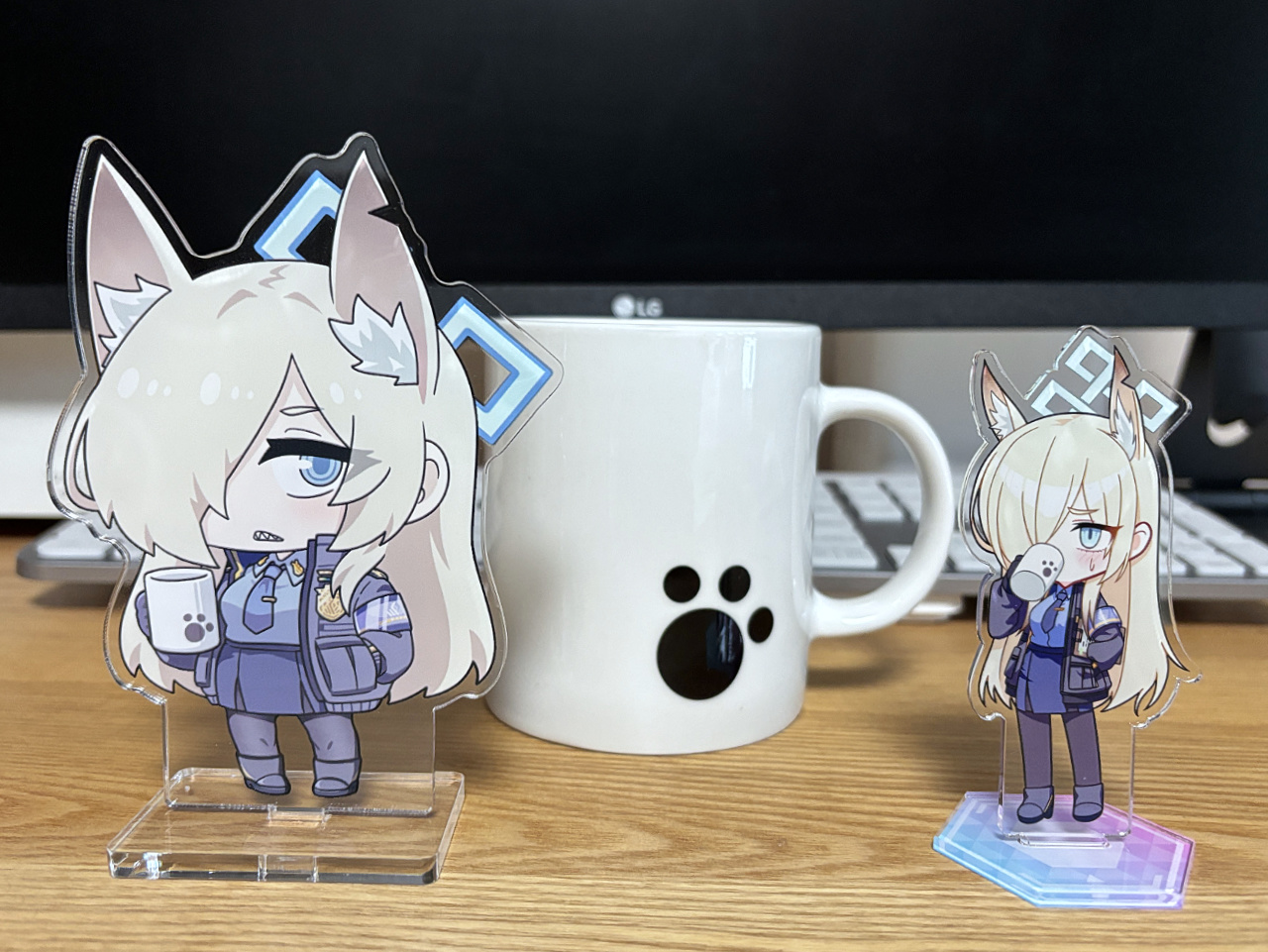 아크릴 일러스트를 인쇄하는 데에 딱 정해진 크기가 있는 건 아니지만 극단적으로 크기 차이가 나는 것도 흥미로운 부분이었습니다. 오른쪽의 작은 칸나 일러스트는 얼추 넨도로이드 크기 정도이고, 왼쪽의 큰 칸나 일러스트는 (일단 머그컵보다 크고) 서 있는 figma 스케일 피겨 높이에 가깝습니다.