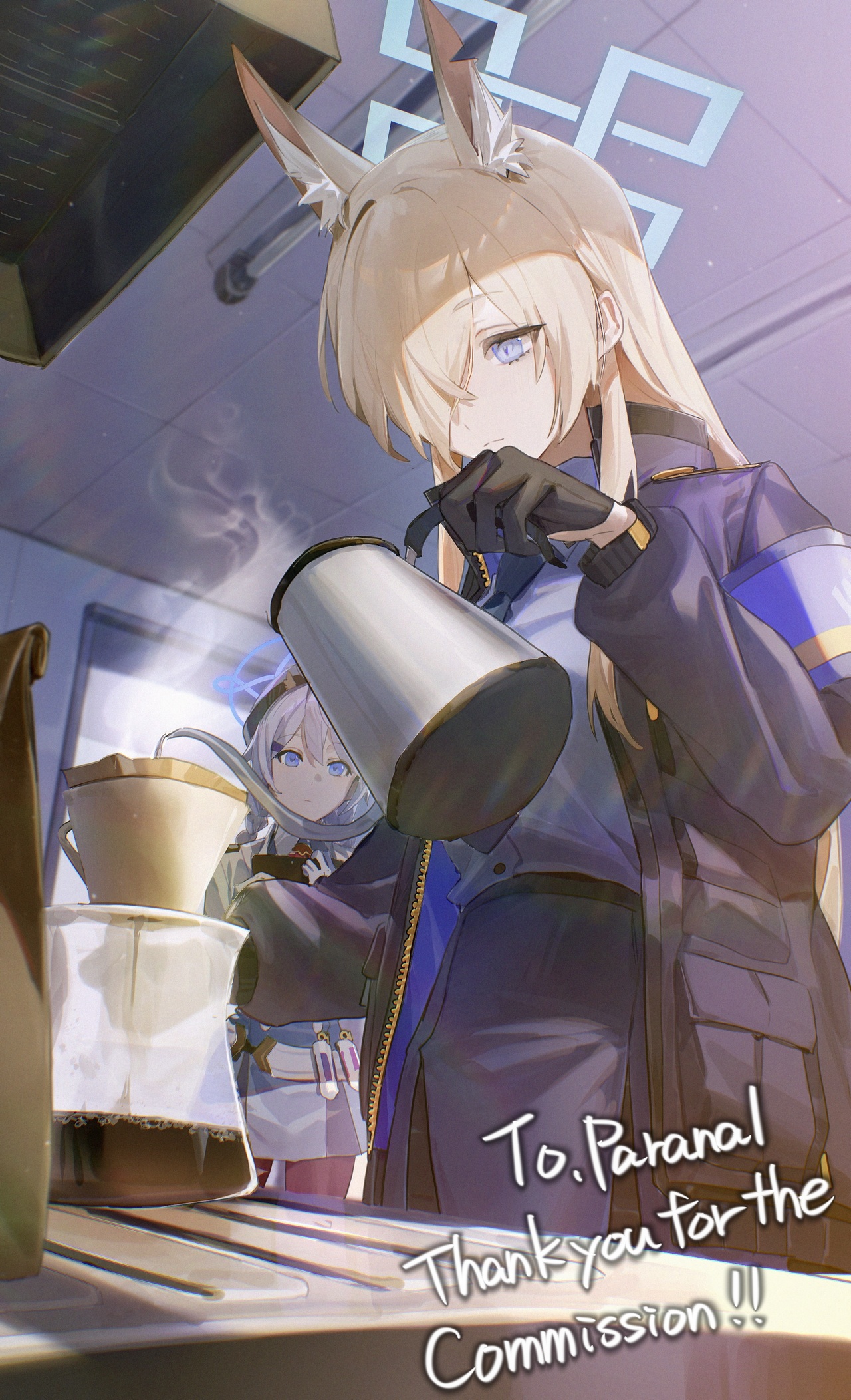 이번에도 캐릭터는 오가타 칸나(블루 아카이브)인데, 아침 첫 일과로 드립 커피를 내리는 모습입니다. 카페인 보충이라는 실용성과 심신안정을 동시에 노린다는 느낌으로 구상했는데요. 뒤쪽에 기웃거리는 키리노도 들어가 있어 일상감이 살아나는 느낌인 게 좋네요.