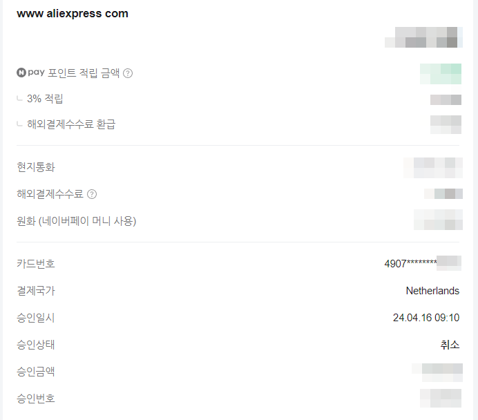 입금이 된 시점에서는 네이버페이 내 '페이' 사용내역에서 해외결제 결제 취소건이라는 사실을 알 수 있게 안내해 주더군요.