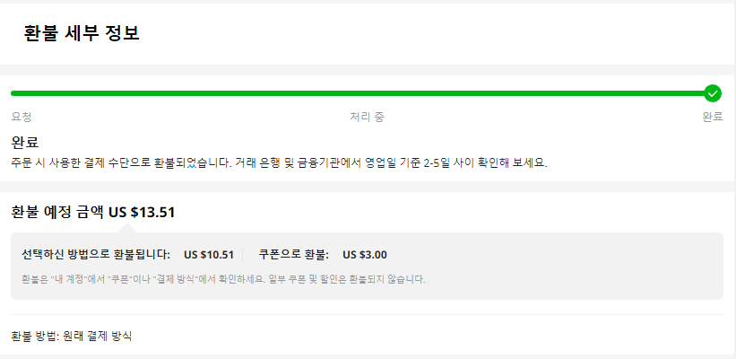 해당 거절 페이지에 추가 소명 자료를 보낼 수 있는 공간이 있어, 제품은 이미 수령했으며(송장번호를 확인할 수 있는 구도의 미개봉 패키지 사진 첨부) 당신들이 해당 주문 상세 페이지에서 보장한 ‘무료 반품’ 권리를 행사하고 싶다는 취지의 내용을 재제출했습니다. 그 이후로 연락이 없어 잊어버리고 있었는데, 닷새가 지난 9일 밤 늦게 환불 신청이 승인되었다는 메일을 받았습니다.