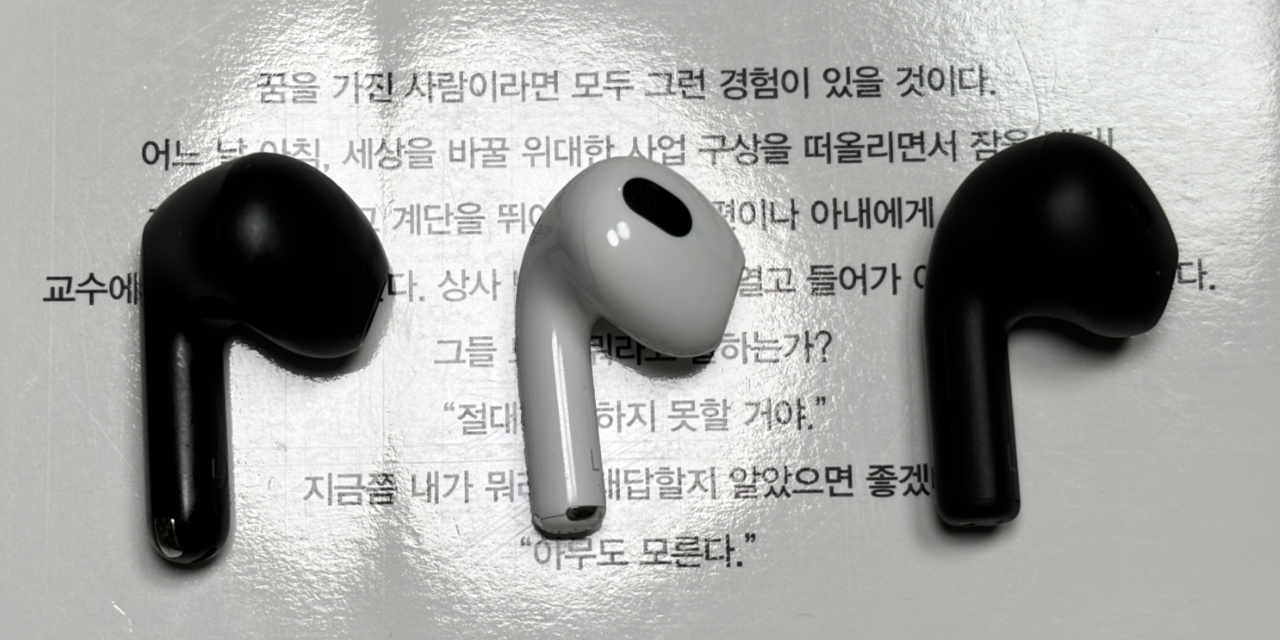 유닛은 AirPods 대비 '콩나물' 막대 부분이 약간 깁니다. 버니어 캘리스퍼로 측정하지는 않았지만 눈대중으로 유닛도 약간 큰 느낌이라 귀가 아플까 걱정했는데 적어도 제 귀에는 올바르게 착용하면 이물감, 압박감이 느껴지지 않았습니다. 다만 제 귀는 유닛이 조금 커져 1/2세대 대비 호불호가 갈리는 3세대 디자인도 무난하게 품었던지라 사람에 따라 다를 수도 있겠네요.