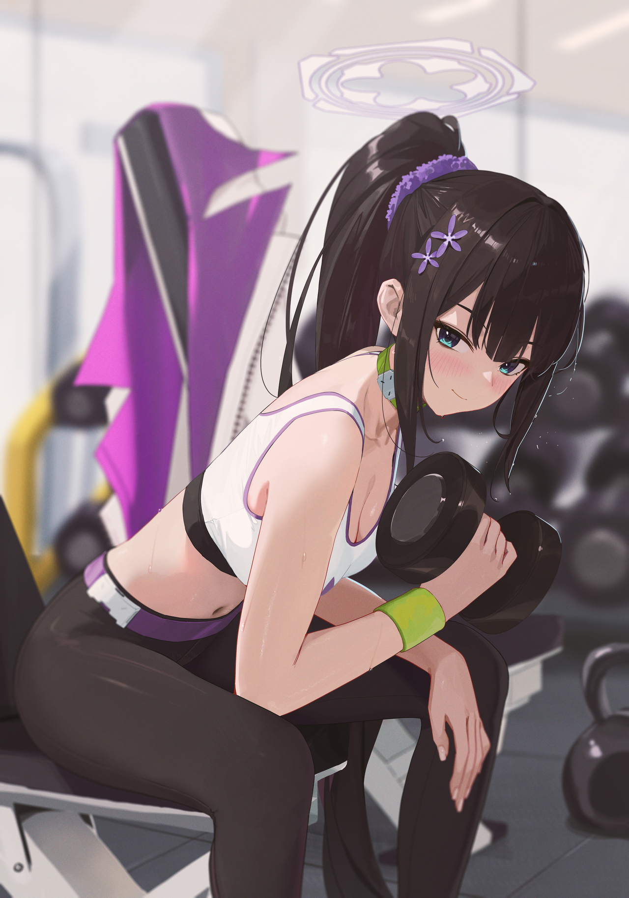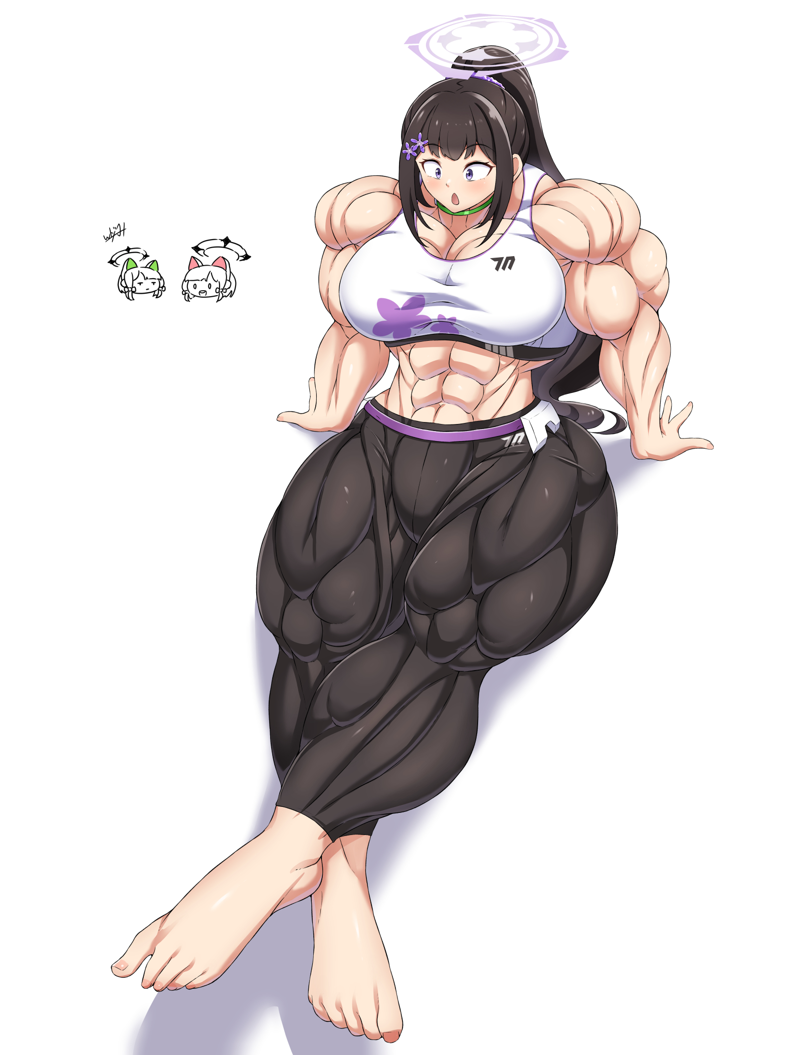 운동복 입은 모습. 원래는 책상물림이어서 살기 위해 시작한 운동이지만 스미레라도 만났는지 운동에 너무 푹 빠져버렸다는 별 쓸모 없는 설정이 있습니다. 복장 아이디어까지는 떠오르지 않아 여성분들 표준 운동복 의상으로 부탁드렸습니다만 그럴듯하게 나왔네요.