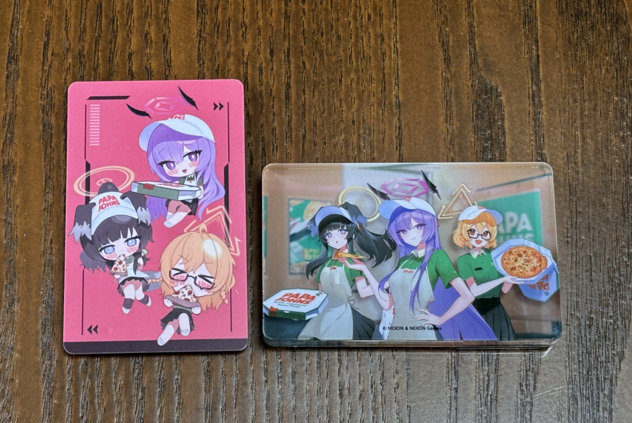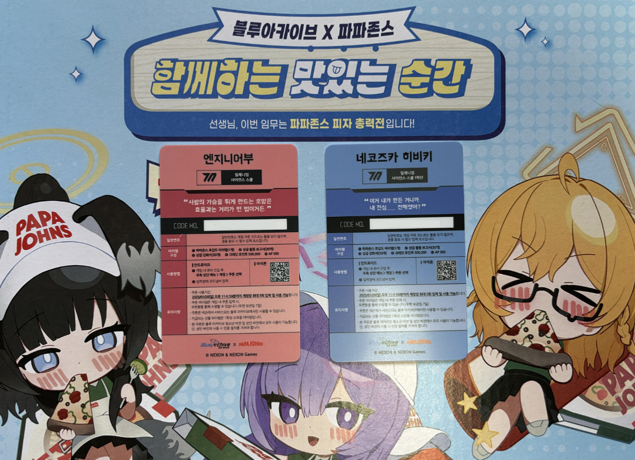 이번 글 주제는 블루 아카이브x파파존스 컬래버입니다. “피자를 정가로 먹는 사람이 어딨냐?”라는 기조 때문에 사은품 이전에 커뮤니티에서는 평가가 뚝 떨어져 버리기도 했는데, 마침 파파존스가 대리점 '갑질'로 공정위에게 가맹사업법 위반 과징금 선고받은 것도 이미지에 도움은 안 되었겠지요(물론 SPC 그룹이 만든 빵을 팔았던 GS25 컬래버는 잘 되었던 걸 보면 침소봉대에 가깝긴 하겠습니다만).