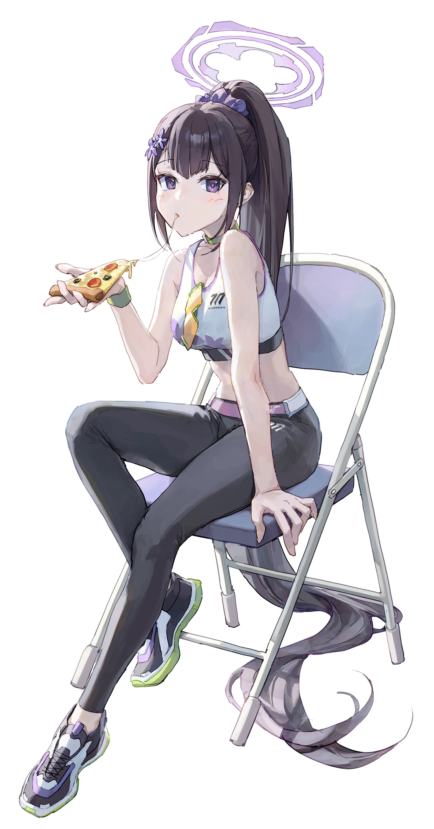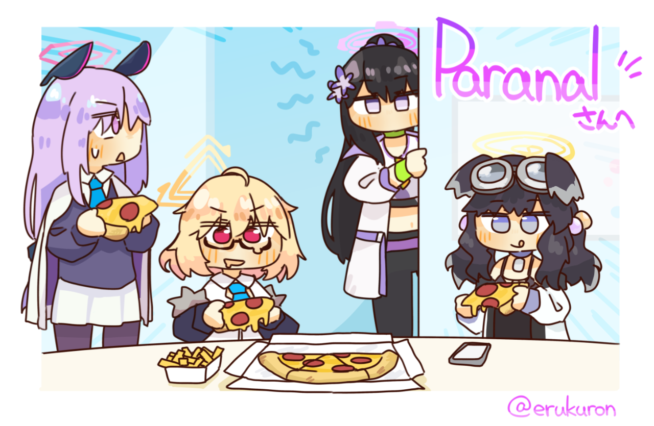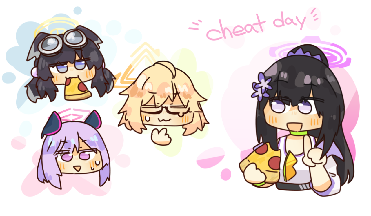 이 작품도 첫 그림처럼 컬래버 기간에 영향을 받아 피자를 먹고 있는 모습입니다. 특히 스미레를 모델로 쓸 경우 의외성도 더할 수 있어 좋다는 발사잉었는데요(여담으로 피자 종류는 특별히 정하지 않았습니다만 작가님이 저렇게 그려 주셨습니다).