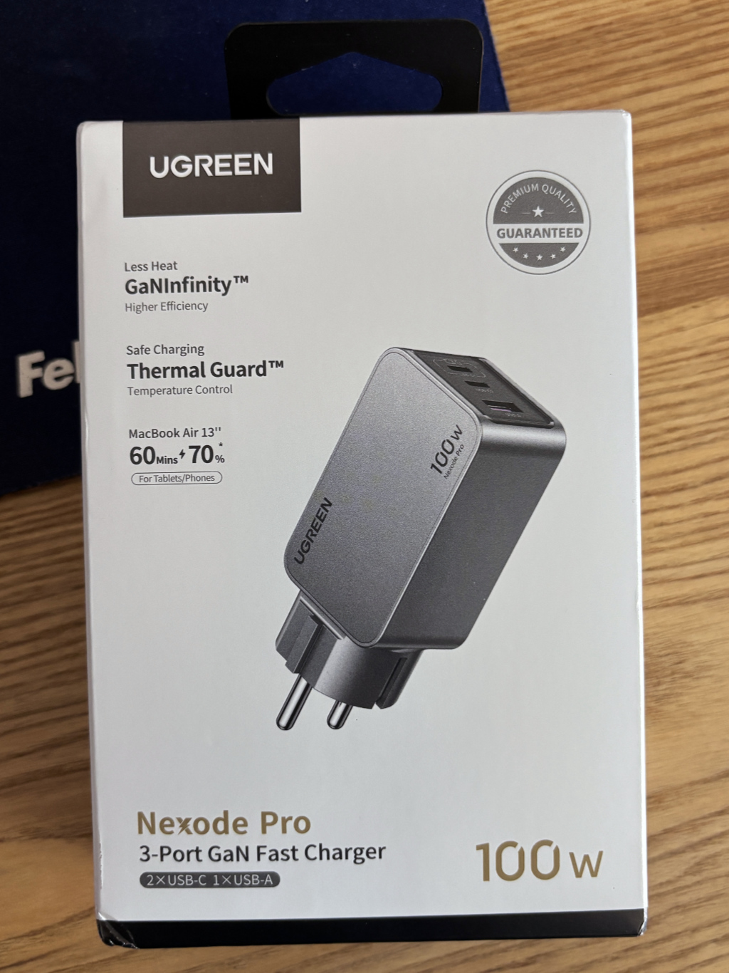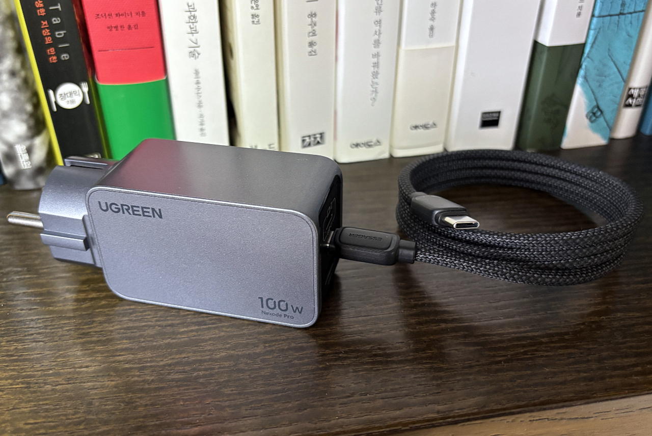 설명서를 읽어보니 이 정도 크기에 100W 출력을 넣는 건 물리적으로 아슬아슬한지 발열 감지되어 스로틀링이 적용되면 최대출력이 합계 65W로 줄어든다는 안내가 있더군요. 지속적으로 100W를 요청하는 기기를 연결한다면(예를 들어 140W 충전기를 동봉하는 Macbook Pro(M4) Pro/Max 라인) 발열처리가 잘 되는 거치형 충전기를 쓰는 게 나을지도 모르겠습니다. 참고로 해당 라인업에서 번들로 제공하는 애플 140W 어댑터 무게는 약 277g이라니 대체품이라 생각하면 무게 이익이 있긴 하겠네요.