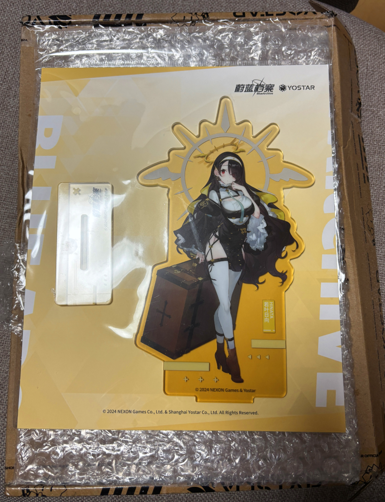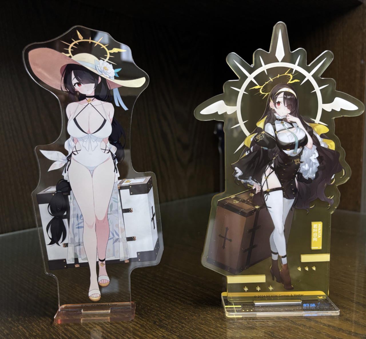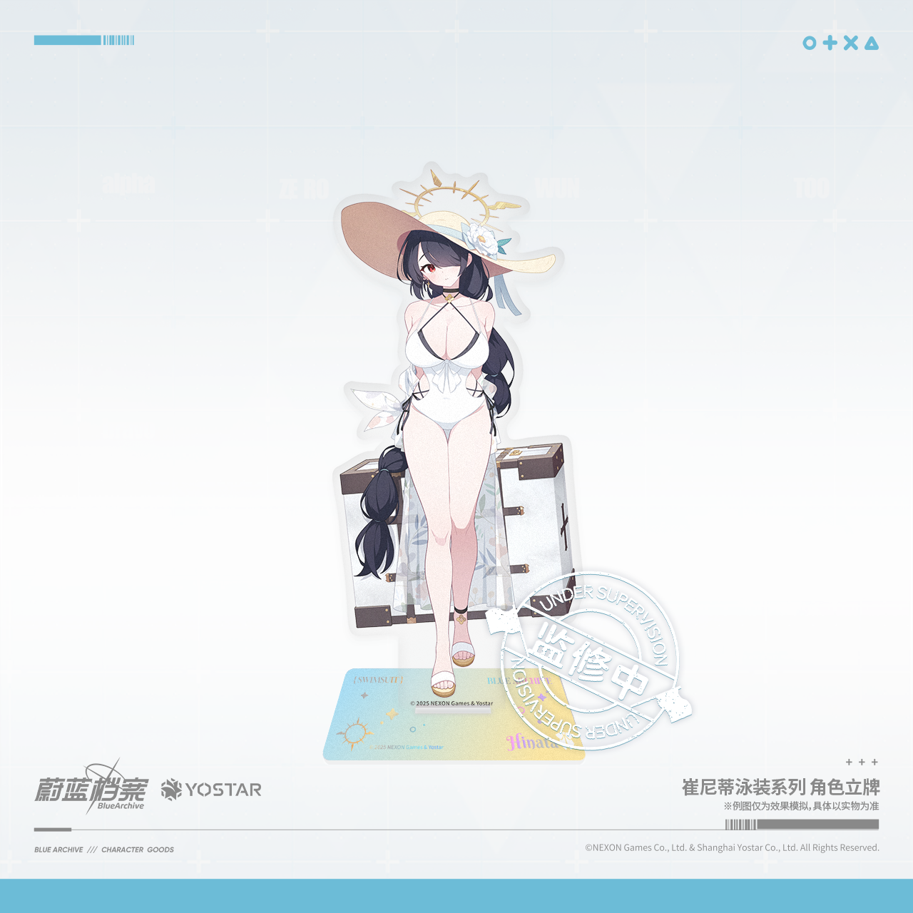 다만 디자인 방침을 바꾸었는지 최근 생산하는 캐릭터 아크릴 스탠드는 일본/한국판처럼 테두리 없이 인게임 일러스트만 잘라낸 형태입니다. (마침 글 작성 시점에 중국 스토어에 수영복 히나타가 추가되어 참고용으로 해당 홍보 사진을 첨부) 다만 받침대는 말 그대로 지지대 역할만 하는 일섭 상품 대비 크기를 키워 캐릭터명 등 디자인을 추가한 형태입니다.