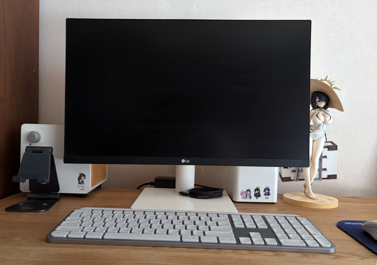 이 글을 쓰는 시점에서는 최대한 제품 값(?)을 뽑기 위해 컴퓨터 책상 한켠에 얹어두었습니다. 다만 이미 꽉 차 있는 책상이라 다른 물건을 치워 억지로 만든 빈자리이기도 하고, 책상다리가 튼튼하지 않아서 책상에서 키보드 두드리면 진동이 전체로 퍼지기 때문에 내구도 때문에라도 여기 계속 놓아둘 수는 없는 상황.