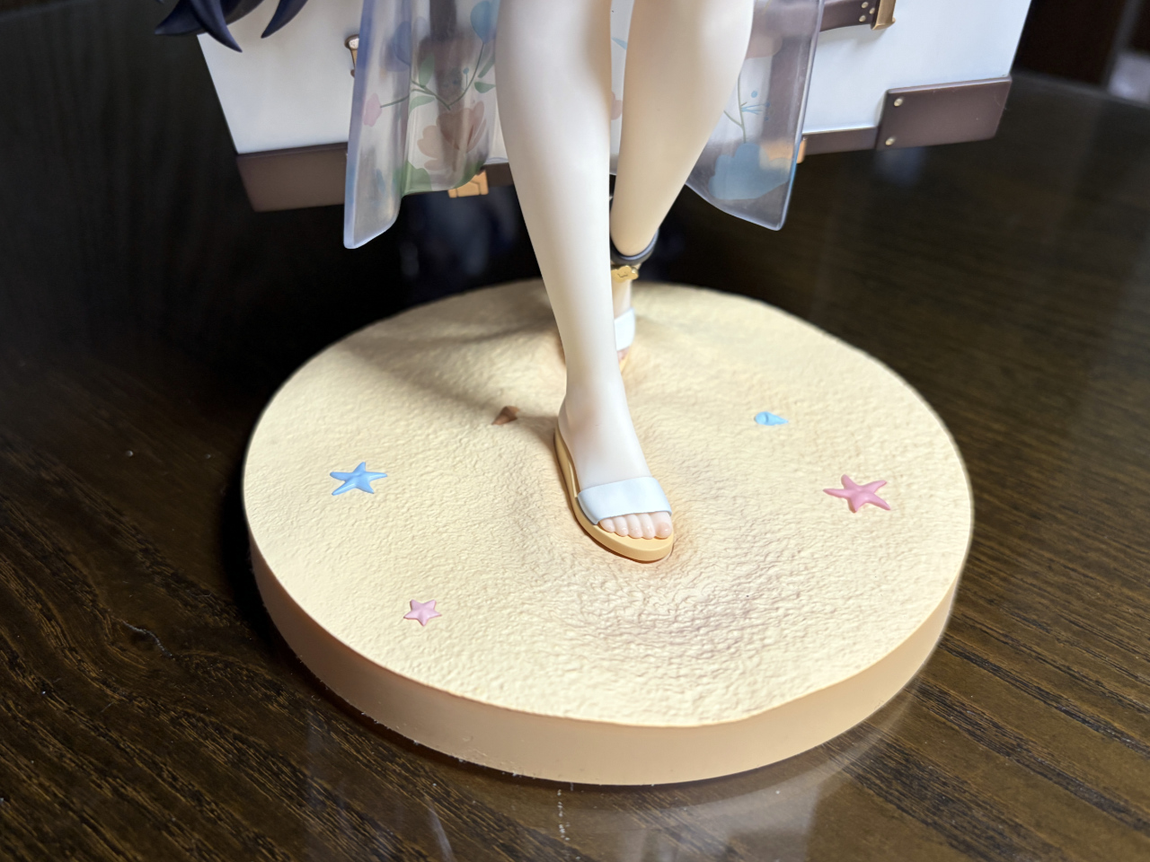 스탠드는 수영복 콘셉트에 맞춰 해변가 느낌입니다. 이미 장착된 뒤여서 사진에서는 보이지 않습니다만 평평한 오른발에 두 개, 왼쪽에 한 개 박혀 있는 철심으로 연결하는 방식인데요. 어차피 관절이 있는 제품처럼 계속 만져야 할 부분은 아니니 크게 중요한 부분은 아닙니다.