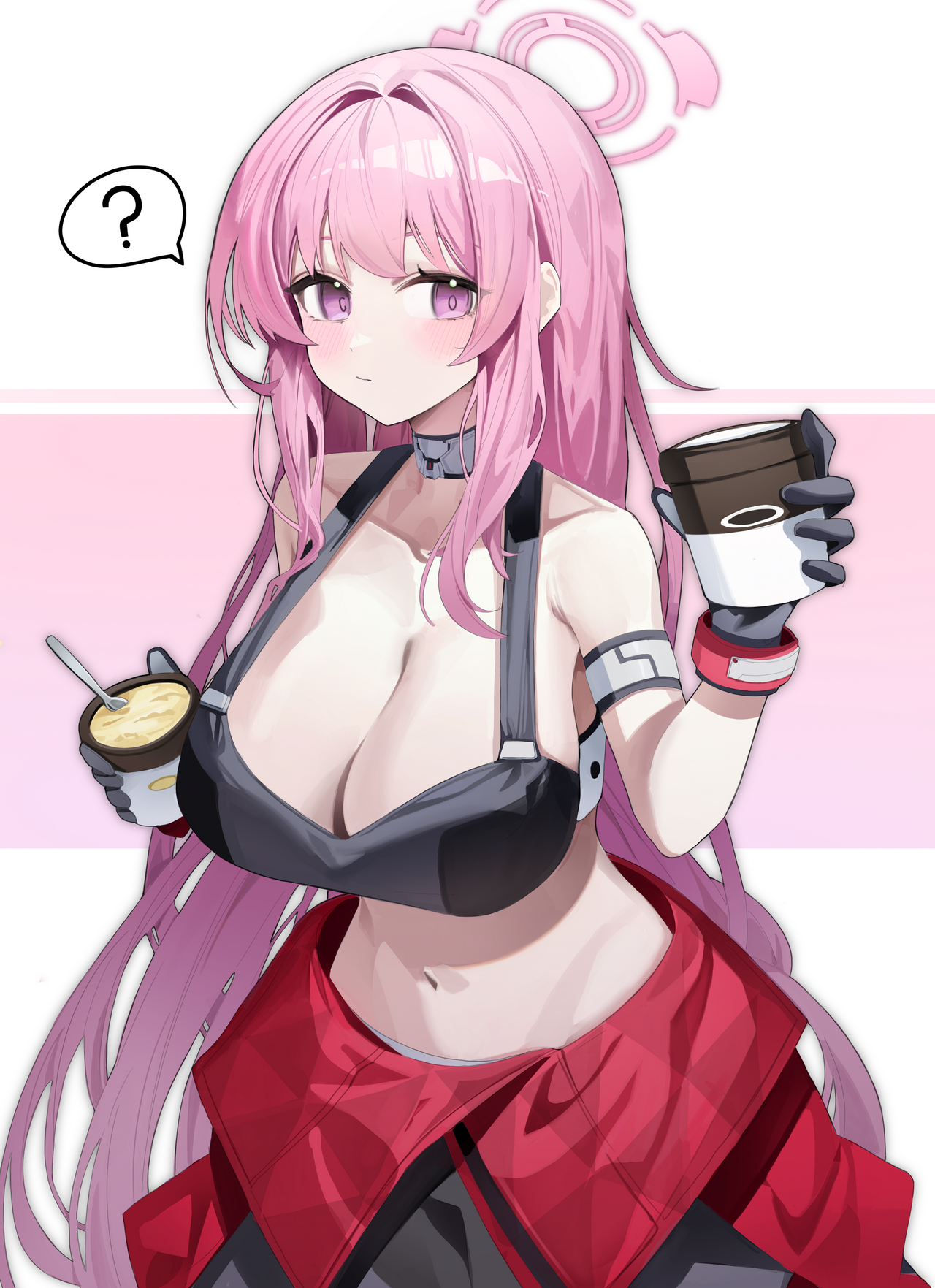 아르바이트 복장을 입고, 이벤트 회장에 있을 법한 팔씨름 경기 홍보하는 역할을 하고 있는 모습입니다. 뒤쪽에 탈 쓴 히나타 (히나탈?)가 있는데, 작가님 코멘트에 따르면 최근 선수급 기행으로 서브컬처 커뮤니티에서 소소하게 화제가 된 카멜탈을 의도한 부분이라고 하네요.