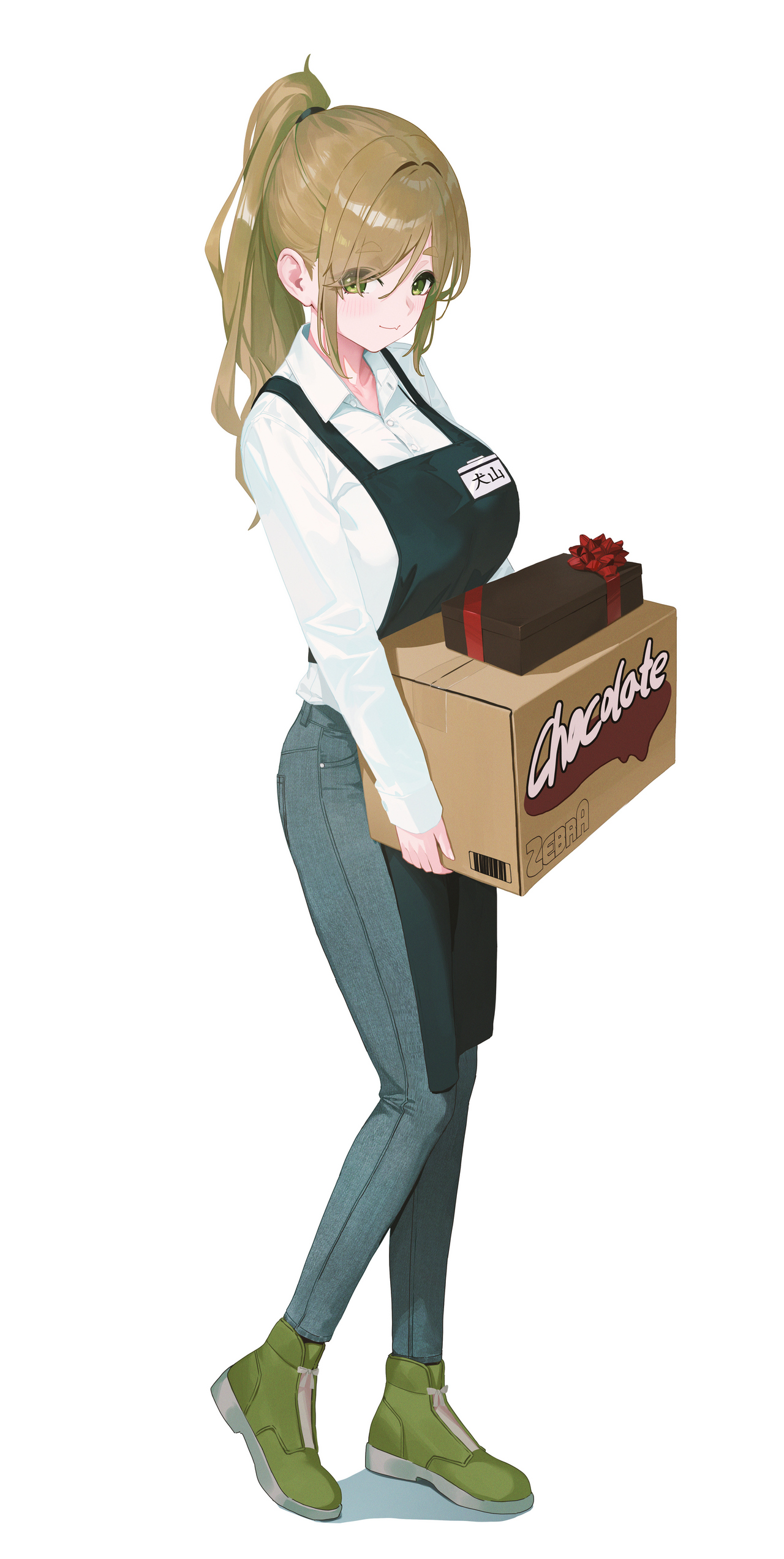 작중에 나왔던 마트 아르바이트 의상을 입고 있는 모습인데요. 당시 시즌에 맞춰 운반하는 건 초콜릿 상품이라는 설정입니다.