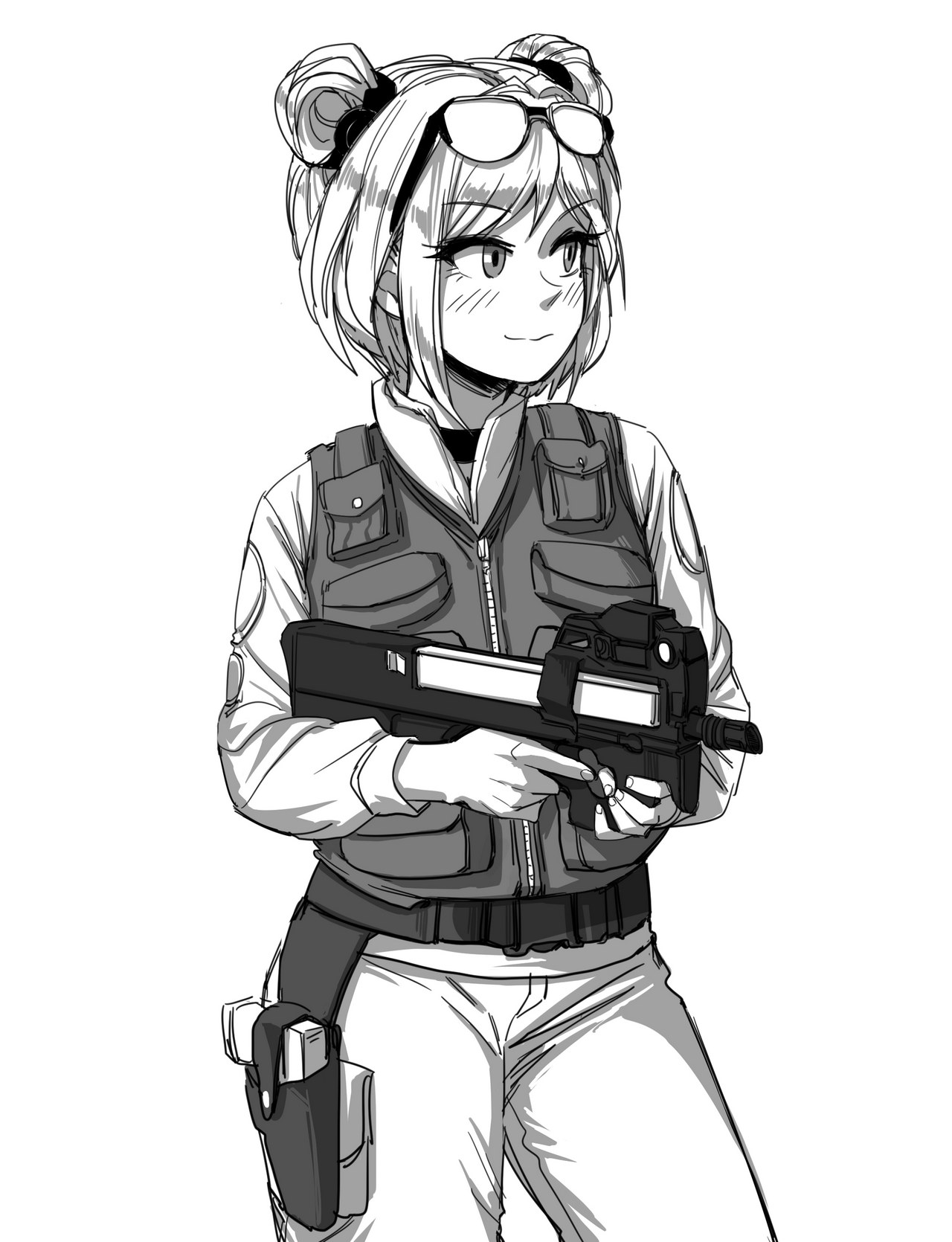 커미션 일러스트에 들어간 소재의 배경 설명은 이 정도로 하고, 제작 과정에 대해 간단히 정리하며 글을 마무리하겠습니다. 결과물을 보시면 아시겠지만 그림 아이디어 자체는 복잡하지 않지만 총(P90)이 꼭 들어가야 한다는 게 문제였습니다. 일본 서브컬처 풍 커미션에서는 총같은 복잡한 소품은 추가 금액 이전에 아예 거절하는 경우가 많기 때문입니다.
