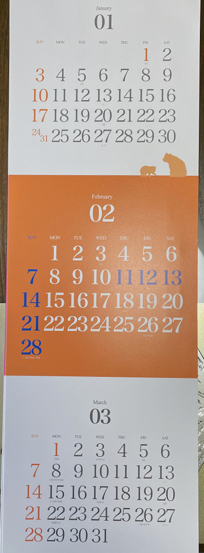 이왕 종이 달력 이야기를 꺼냈으니 관련된 이야기를 덧붙이자면, 월간 달력에서 일자 표시가 점점 작아지는 게 불편하더군요. 탁상달력을 개인 책상에 두고 다이어리 대용으로 쓰는 수요가 많기 때문이라 짐작합니다만, 한 해동안 펜이 닿는 일 없이 날짜만 빠르게 확인하고 싶은 사람도 배려해 주었으면 하는 바람이 있습니다.