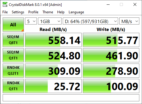 개인 사용자에게 딱히 의미는 없지만 저장장치 관련 글을 쓰면서 없으면 허전한 DiskMark 수치 캡처로 글을 마무리하겠습니다.
