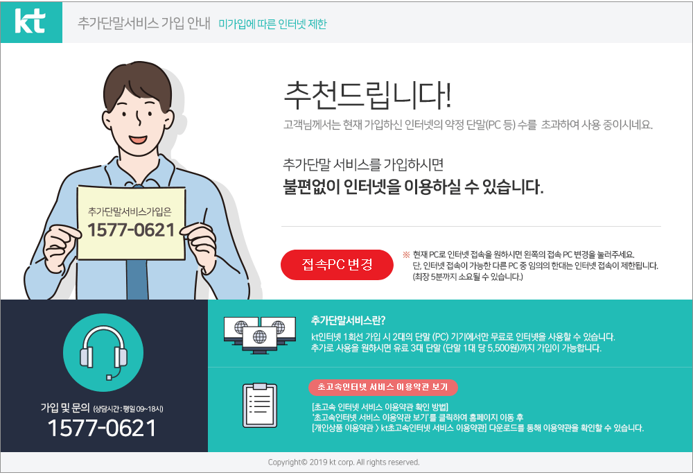 6월 초부터 본가 인터넷을 사용할 때 간간이 계약된 것보다 많은 PC를 사용하고 있으며 추가단말서비스에 가입해야 한다는 에러 메시지가 뜨기 시작했습니다. TLS 연결 페이지에 들어가거나, 계속 새로고침하면 구렁이 담 넘듯 사라져 견디고 지냈는데, 어느 날은 대체 무슨 속셈인가 싶어 KT 대표번호(100번)로 문의해 봤습니다.