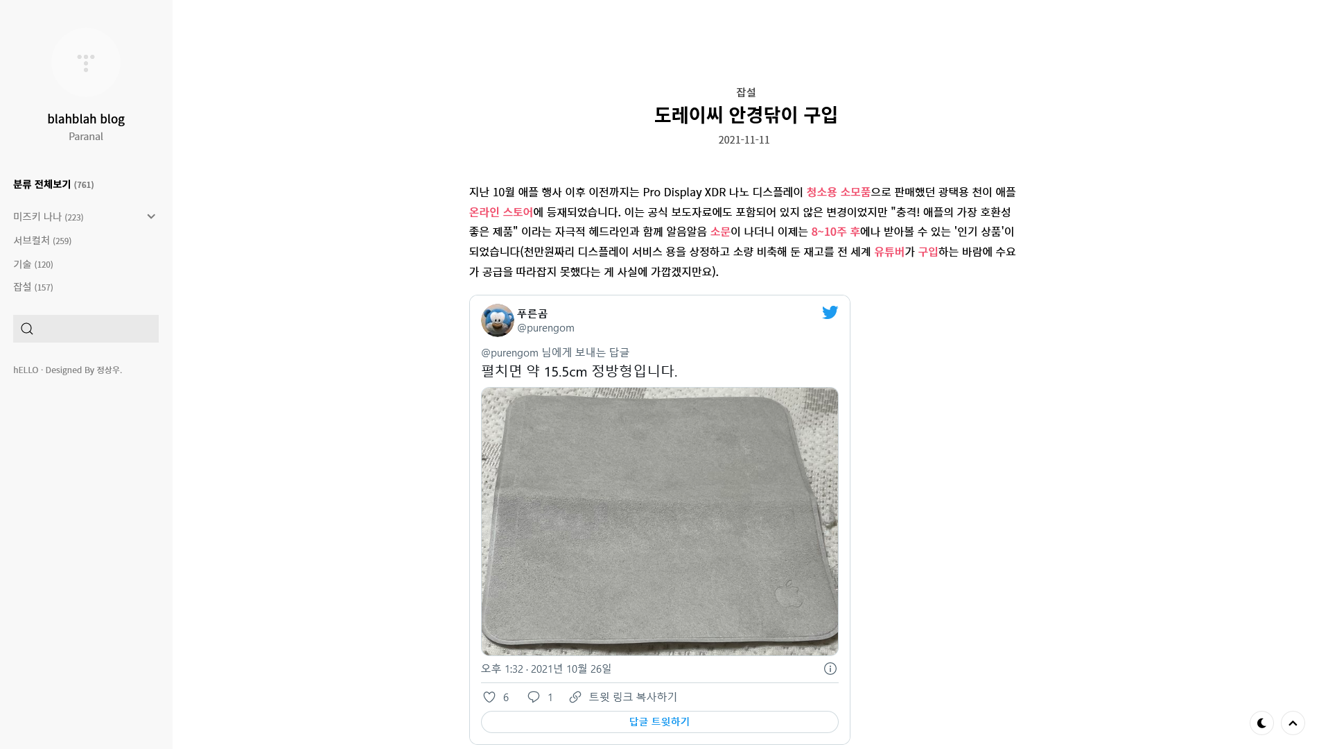 티스토리 스킨은 2020년 1월 마지막으로 바꾼 바 있는데, 오랜만에 티스토리 스킨 홍보 페이지를 살펴보다 괜찮은 스킨이 있어 변경해 보았습니다. 이번에는 이전 스킨과 달리 크게 수정한 부분이 없어(트위터 oEmbed 추가 정도?) 심각하게 깨지는 글은 없으리라 생각합니다만, 혹여 발견하신다면 덧글로 연락 주시면 확인해 시정하도록 하겠습니다. 공유하기 게시글 관리 blahblah blog