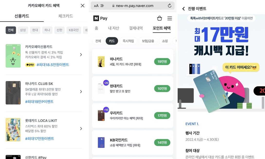 신청받는 장소는 카드사 직접 광고 집행(주로 전업 카드사)부터 네이버페이/카카오페이/토스 등 결제 플랫폼, OK캐시백이나 각 회사의 보조 플랫폼(국민 리브메이트, 롯데 L페이)까지 다양합니다. 검색 엔진에 관련 키워드(예. "n월 카드 신규 이벤트")로 검색해보면 주요 플랫폼에 대해서 매 달 초 정리한 도표가 올라오기도 합니다만, 결국은 손품을 좀 팔아야 합니다.