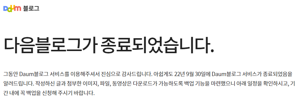 * 2022-10-02 추가: 다음 블로그는 예정대로 9월 30일자를 기해 폐쇄되었습니다. 폐쇄 이전까지 제공하던 티스토리 이전 기능은 막혔지만, 공지에 따르면 2023년 9월 28일까지는 기존 블로그 글(미디어 포함) 백업은 가능하다고.