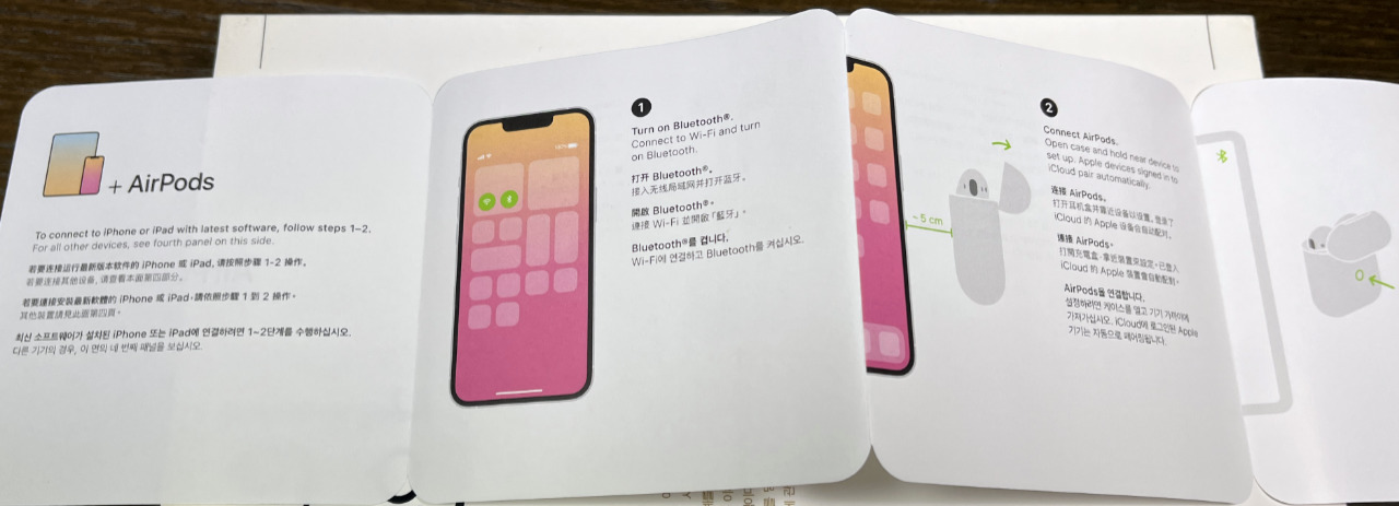 연결 방법 북클릿 또한 최신 제품에 맞게 갱신되어 있는 것도 눈에 들어왔습니다(2019년 제품에서는 iPhone 8 실루엣). 뒤쪽에 작게 찍힌 저작권 표시에 따르면 2022년에 인쇄분으로 보이네요. 다른 법적 문서의 경우도 (제품이 출시된 다음 해인) 2020년이 찍혀 있는 걸 보면 같은 제품이라도 처음 찍어놓은 템플릿을 단종할 때까지 사용하는 건 아닌가 봅니다.