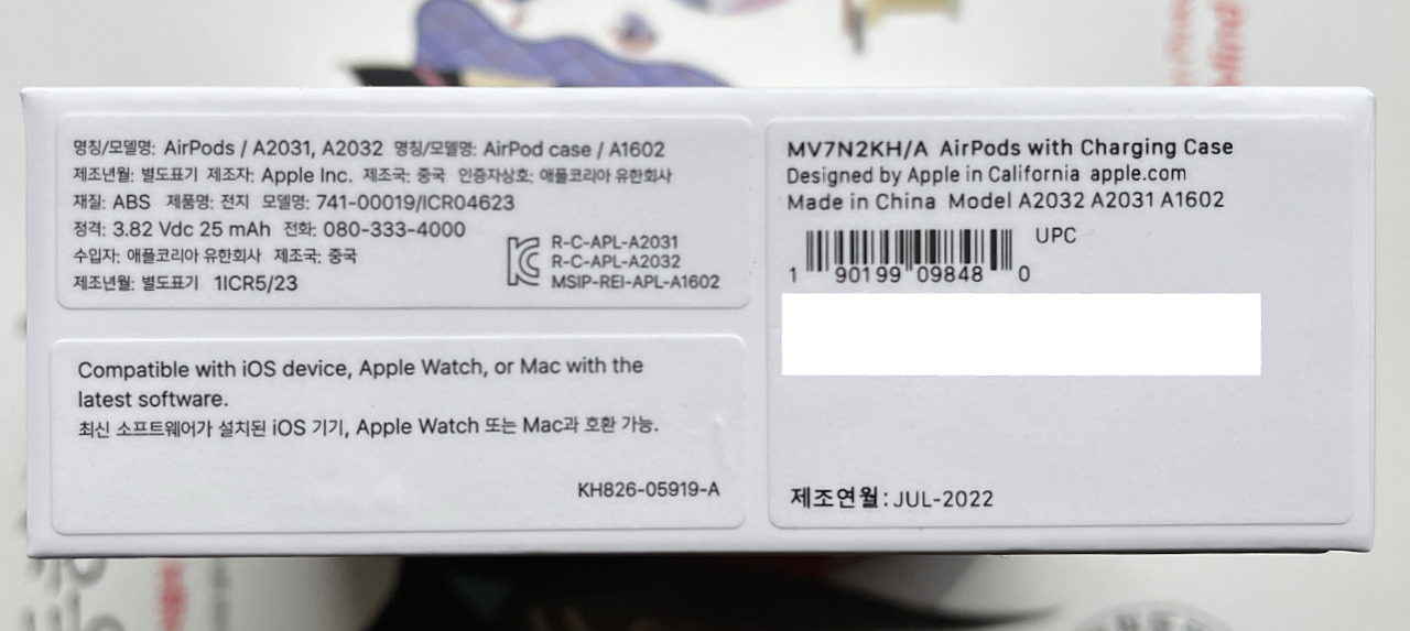 포장 상자에서 익숙한 패키지를 꺼낸 뒤 바로 측면에 찍힌 생산월부터 확인했는데 2022년 7월이었습니다. 수요가 없어 올 초에 생산한 제품이 오는 건 아닐가 걱정했는데, 막상 제품을 받고 생각해보니 재고를 혁신해 CEO까지 오른 팀 쿡이 이끄는 애플이니 그런 생각은 기우였나보다 싶네요.