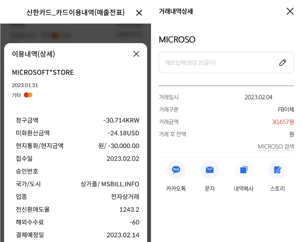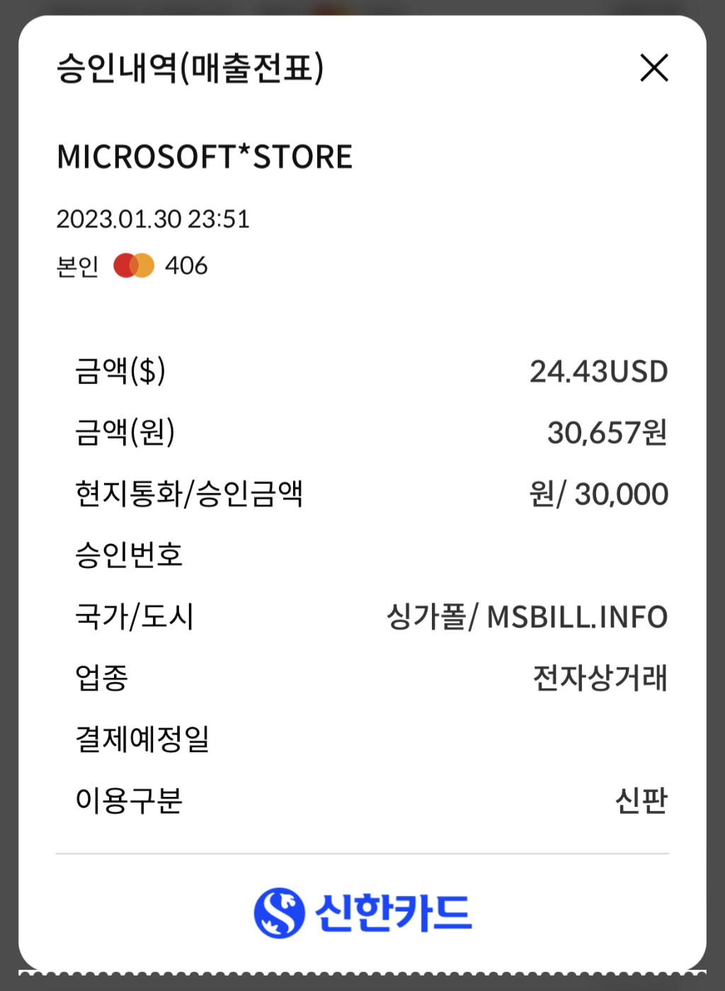 해외 결제 관련해서 기묘한 일을 당해서 짧게 글을 써 봅니다. 시작은 지난 31일 아침이었습니다. 보통은 기상 후 루틴으로 자는 시간동안 쌓인 iPhone 알림을 확인하는데 가는 날이 장날이라고 그날따라 아침에 일이 많아 뒤늦게 열어 봤었네요. 그런데 알림을 훑어보다 전날(30일) 23시 경 마이크로소프트에서 DCC로 3만원 결제건이 있더군요.